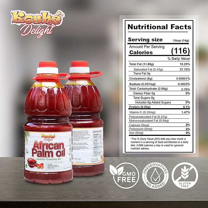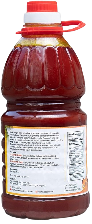 Koshe delight is a red palm fruit oil gotten purely from squeezed palm fruits, different from vegetable oil due to the process. the palms are carefully sourced from healthy palm trees in nigeria. it does not contain additives and is non-GMO.